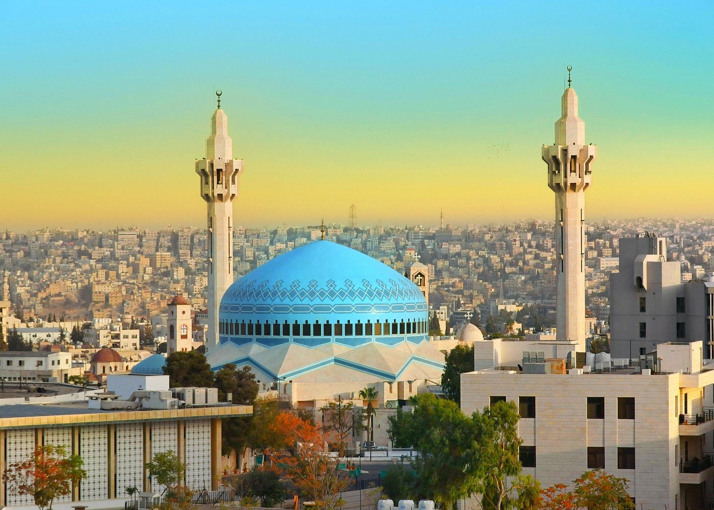 صورة بانورامية تظهر مسجد الملك عبد الله الأول في عمّان، الأردن